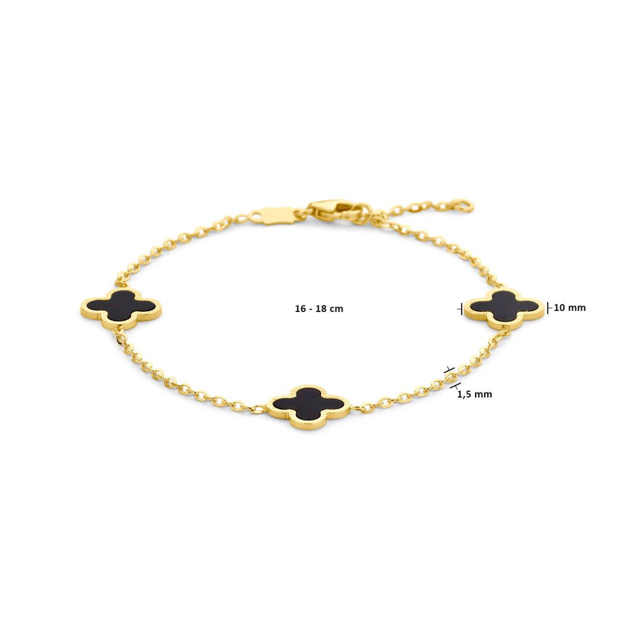 14k Geelgouden armband uitgevoerd met klavertjes 4 met onyx. De draaglengtes zijn 16 en 18cm. De klavertjes hebben een afmeting van 10x10mm. De schakelbreedte is 1,5mm. Uitgevoerd met een karabijnsluiting.