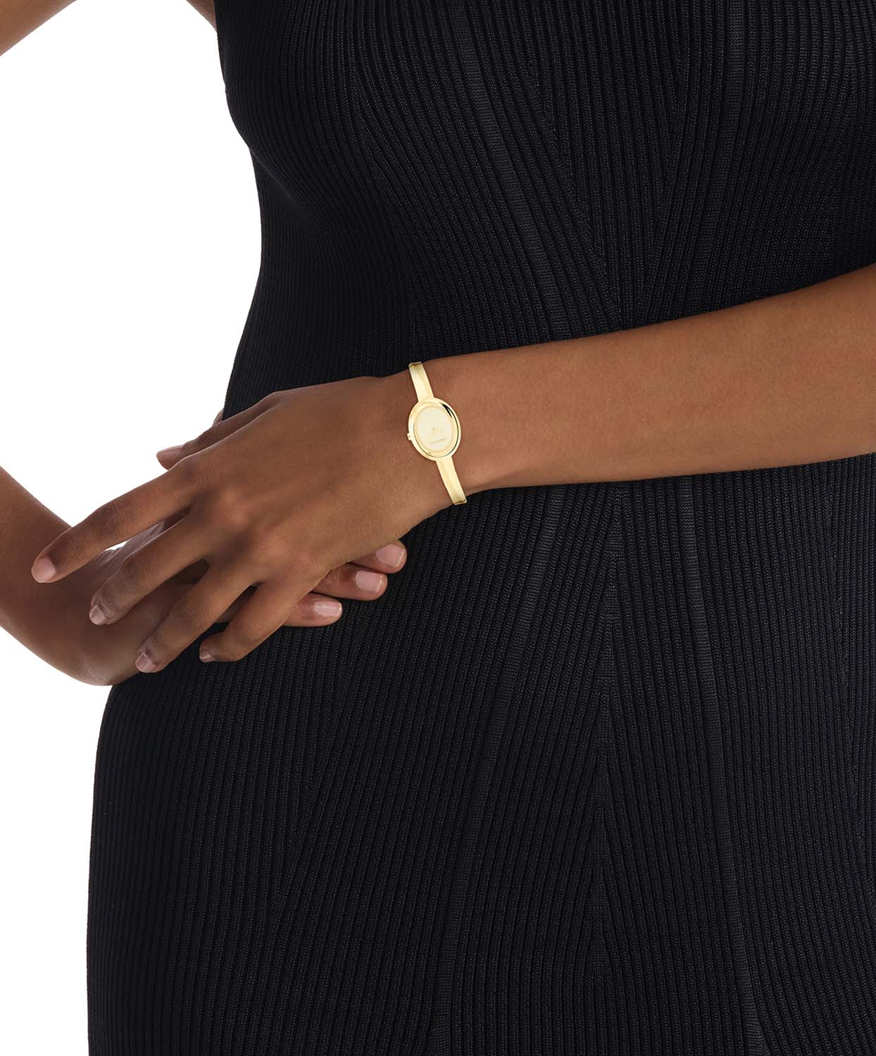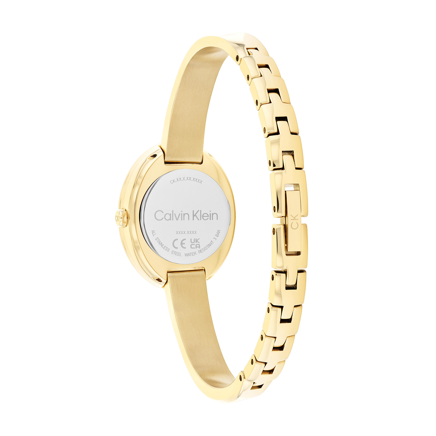 Dit Calvin Klein dameshorloge met nr CK25100056 is een chique en stijlvol ontwerp. De stijlvolle goudkleurige ovale stalen kast heeft een goudkleurige glanzende wijzerplaat met enkel wijzers en de merknaam. Strak aan de vol glimmende kast zit een goudkleurige bangle band met klapsluiting. Inkorten kan dmv schakels te verwijderen aan de onderkant. Het opvallende horloge heeft een mineraalglas, een doorsnee van 26mm en is 3ATM.