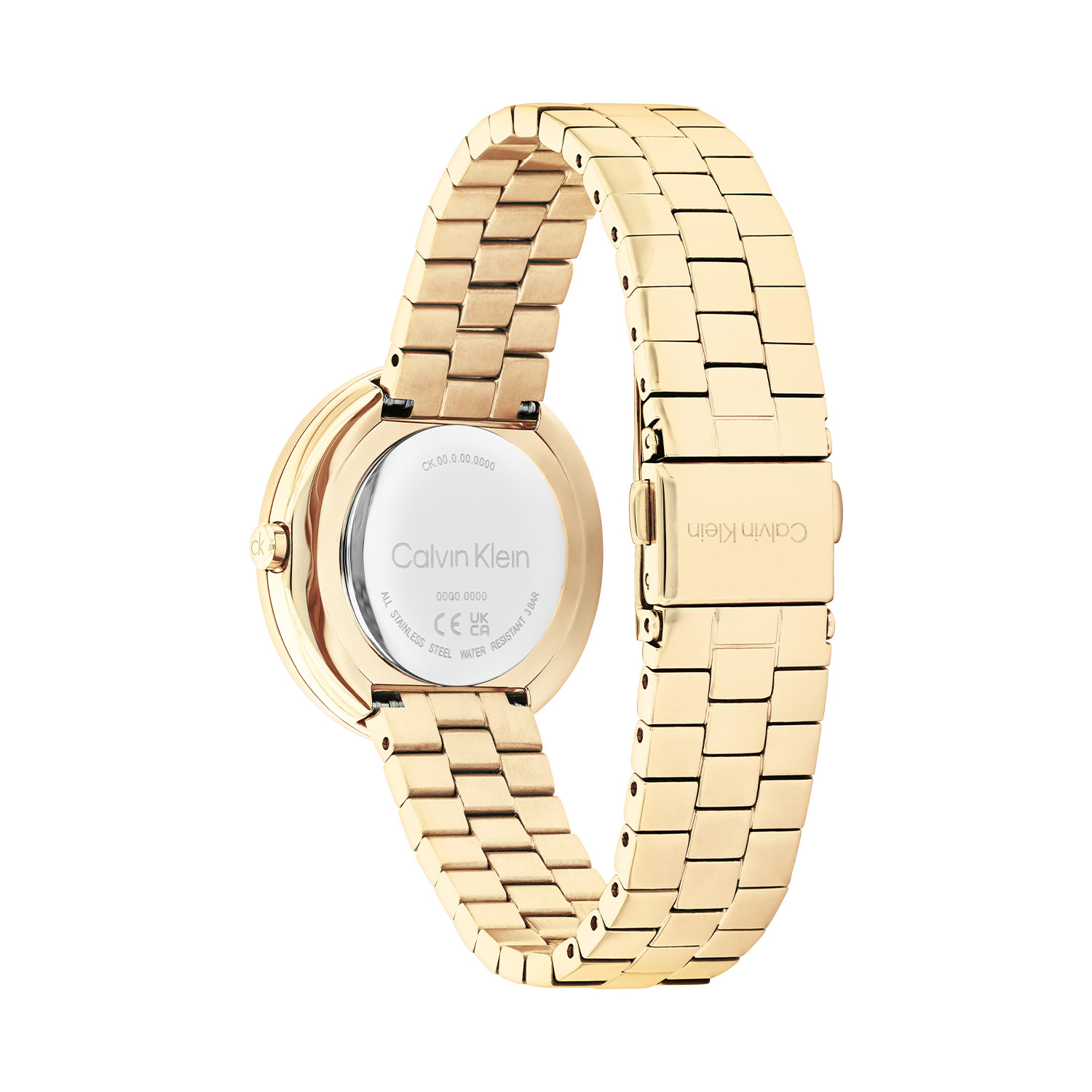 Dit Calvin Klein dameshorloge met nr CK25100094 is een tijdloos ontwerp. De stijlvolle ronde goudkleurige stalen kast heeft een gladde gedraaide bezel en een goudkleurige sunray wijzerplaat met fijne wijzers en kristallen op de 3,6,9 en de 12. Strak aan de kast zit een stalen glanzende goudkleurige schakelband met een vouwsluiting. Het elegante dameshorloge heeft een mineraalglas, een doorsnee van 34mm en is 3ATM.