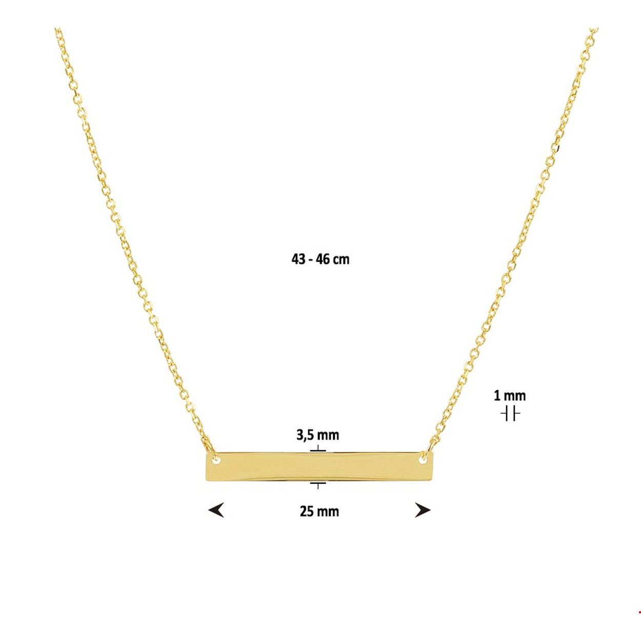 14k Geelgouden anker collier uitgevoerd met een graveerplaat van 3.5x25mm. Het collier heeft draaglengtes van 43 en 46cm.