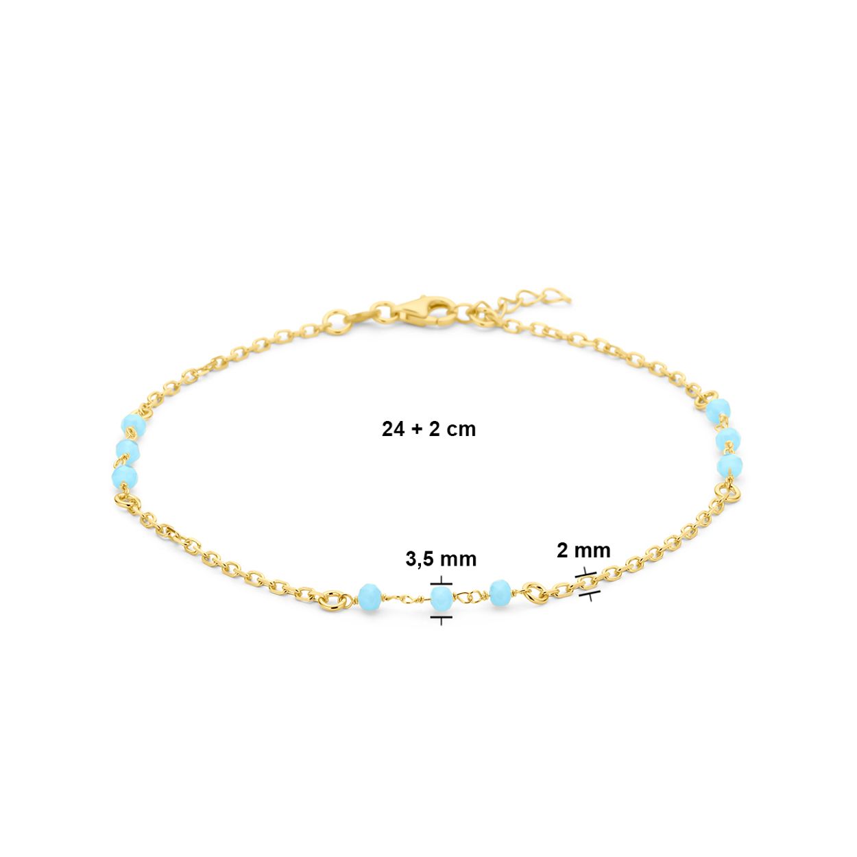 Geelgoud op 925 zilveren enkelbandje uitgevoerd met blauw kristal bolletjes. Het enkelbandje heeft een draaglengte van 24cm en een extensie van 2cm. Uitgevoerd met een karabijn sluiting. Geen garantie op de plating.