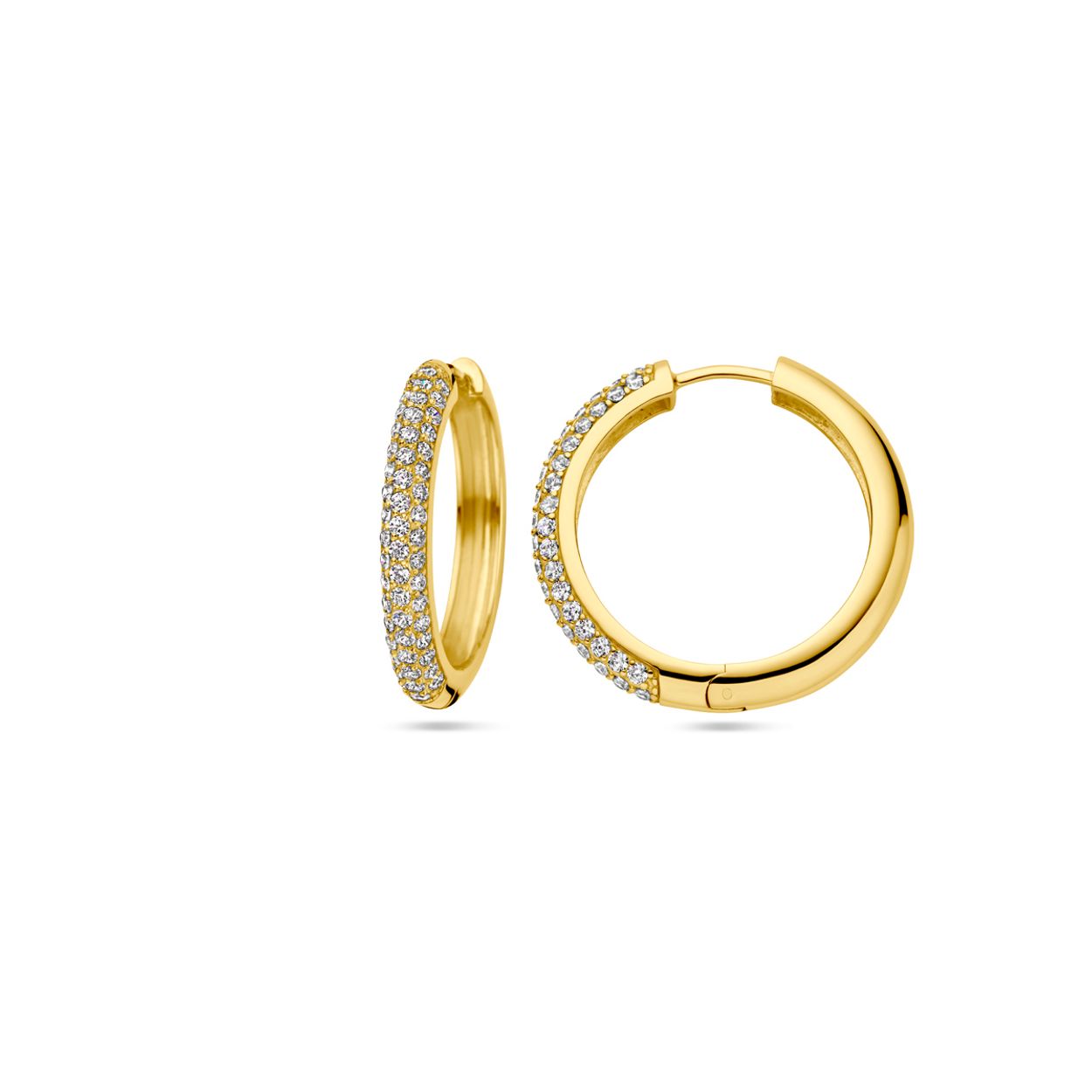 Geelgoud op 925 zilveren klapoorringen uitgevoerd met zirkonia. De klapoorringen hebben een afmeting van 26x4mm. Geen garantie op de plating.