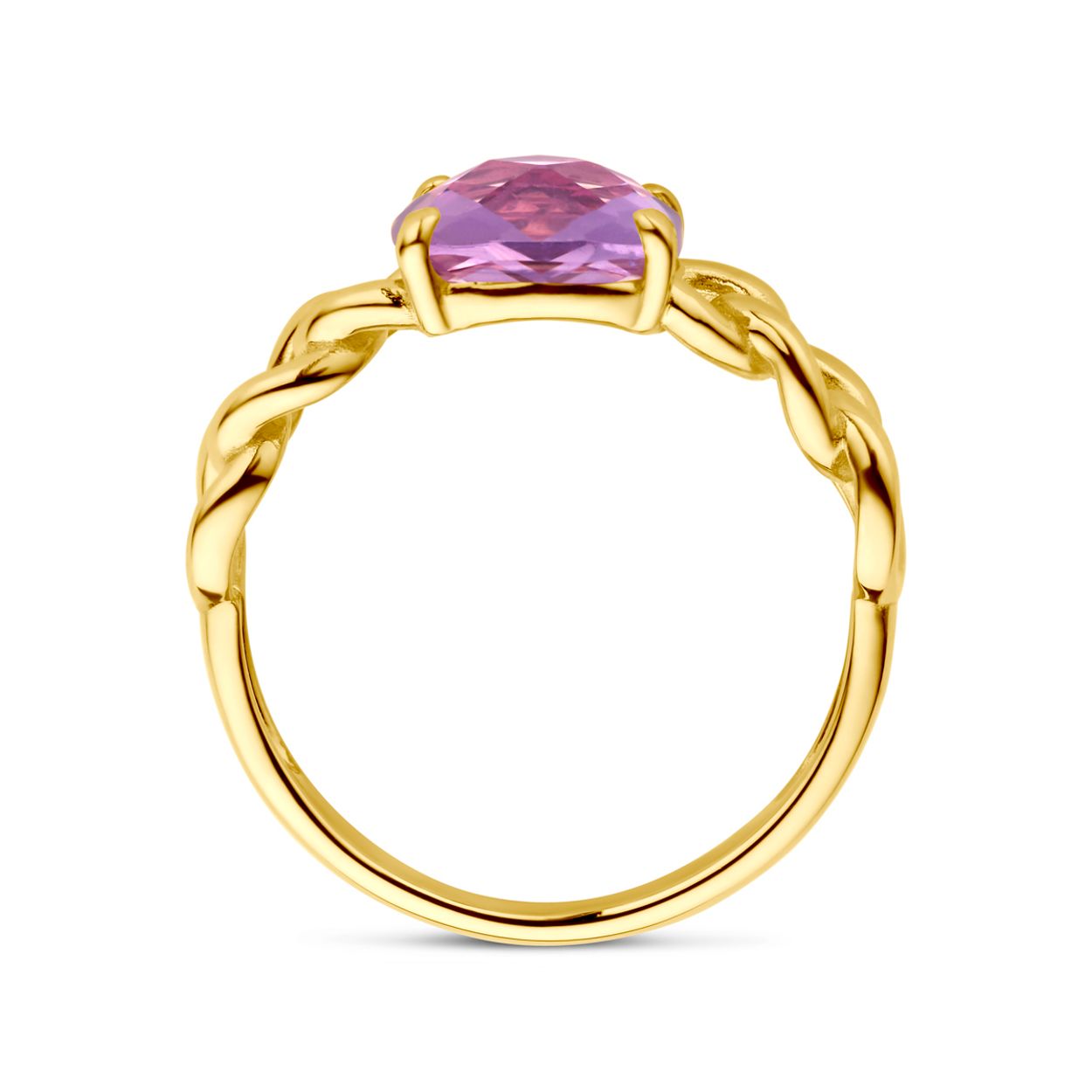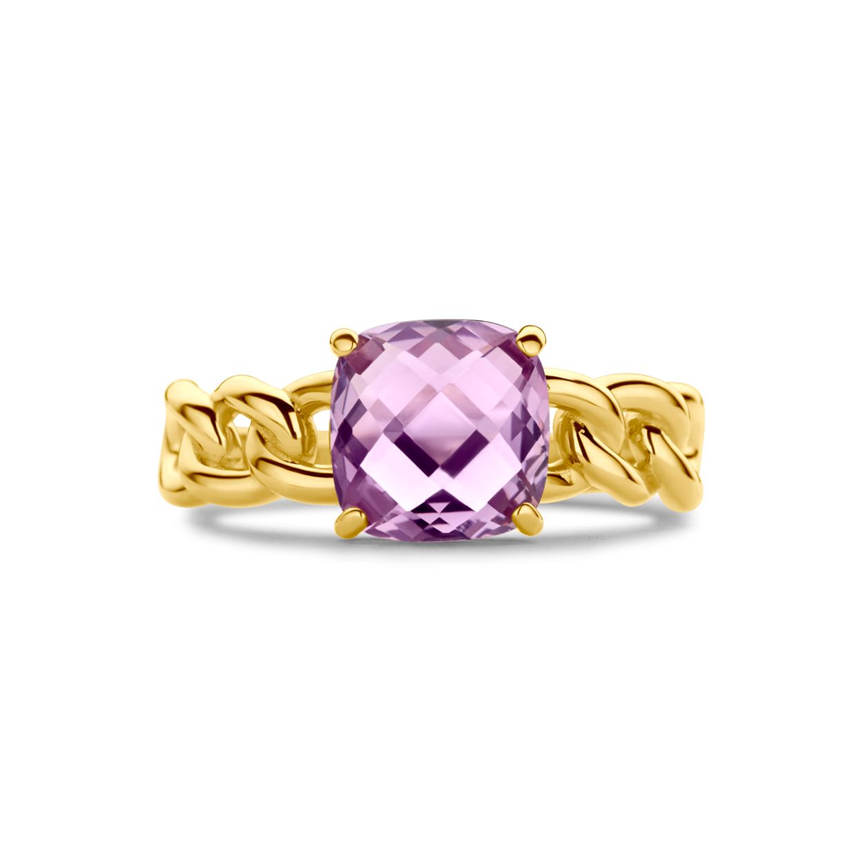 14k Geelgouden ring met schakelmotief, uitgevoerd met een amethist. De ring heeft een breedte van 8mm.