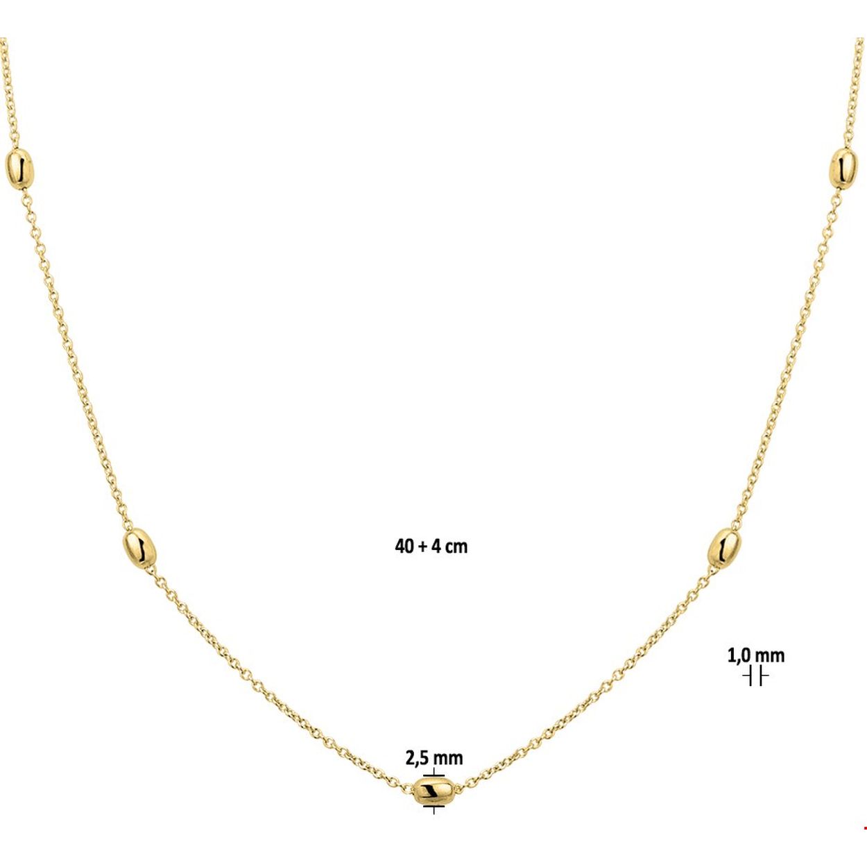 Beschrijving: Fijn geelgoud op zilveren bolletjes collier met een draaglengte van 40cm en een extensie van 4cm. Uitgevoerd met een anker schakel van 1.0mm en een stevige karabijn sluiting. De bolletjes hebben een afmeting van 2.5x3.6mm. Het collier is te combineren met bijpassende sieraden uit onze collectie.