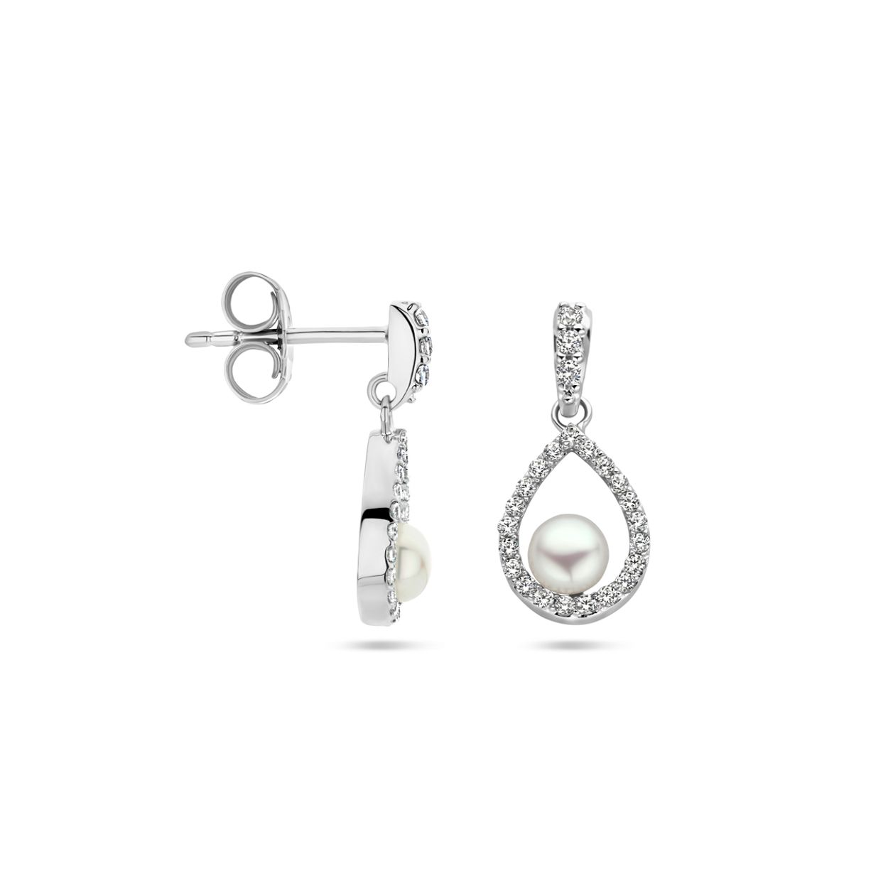 Gerhodineerd 925 zilveren oorhangers uitgevoerd met een zoetwaterparel en zirkonia. De oorhangers hebben een totale hoogte van 16mm.