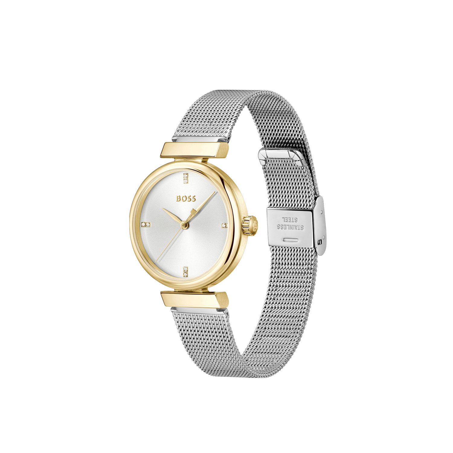Dit BOSS horloge uit de ROSEHILL serie met artikelnr: HB1502853 heeft een chique uitstraling. Het gaat niet alleen om de tijd, maar ook om elk moment te grijpen en er je eigen draai aan te geven. Wees je eigen baas, bepaal je eigen tempo en ga ervoor. Dit dameshorloge valt op door de stalen goudkleurige horlogekast met een zilverwitte sunray wijzerplaat met kristallen als uursaanduiding op de 3,6,9 en 12. Aan de kast zit een bicolor milanese band met een druksluiting. Het horloge heeft een doorsnee van 32mm, een mineraalglas en is 3ATM.