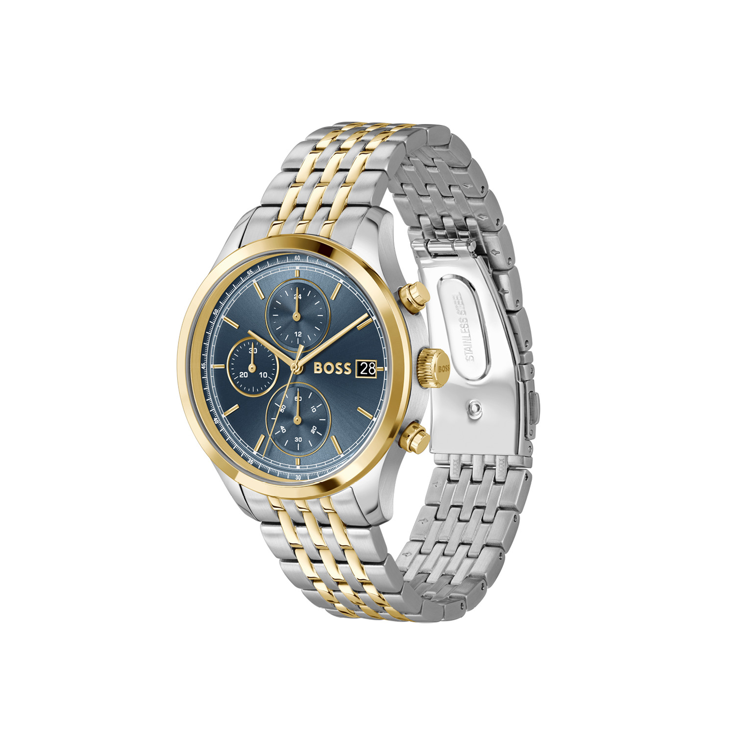 Dit BOSS horloge uit de STRATUS serie met artikelnr: HB1514329 heeft een nette uitstraling. Het gaat niet alleen om de tijd, maar ook om elk moment te grijpen en er je eigen draai aan te geven. Wees je eigen baas, bepaal je eigen tempo en ga ervoor. Het herenhorloge valt op door zijn stalen horlogekast met een goudkleurige bezel, blauwe sunray wijzerplaat met een chronograaf en een datum. Aan de kast zit een stalen bicolor schakelband met een vouwsluiting. Het horloge heeft een doorsnee van 41mm, een mineraalglas en is 5ATM.