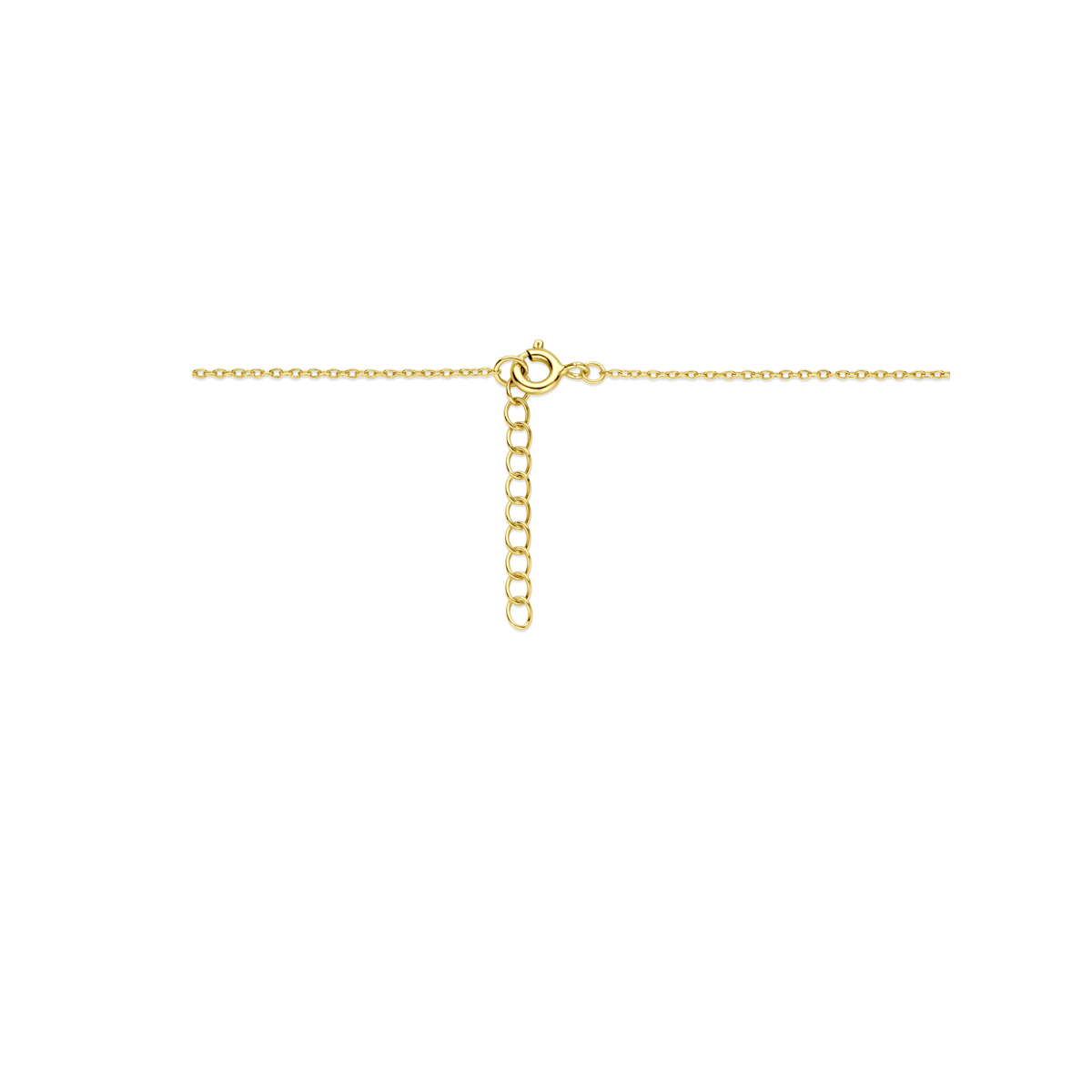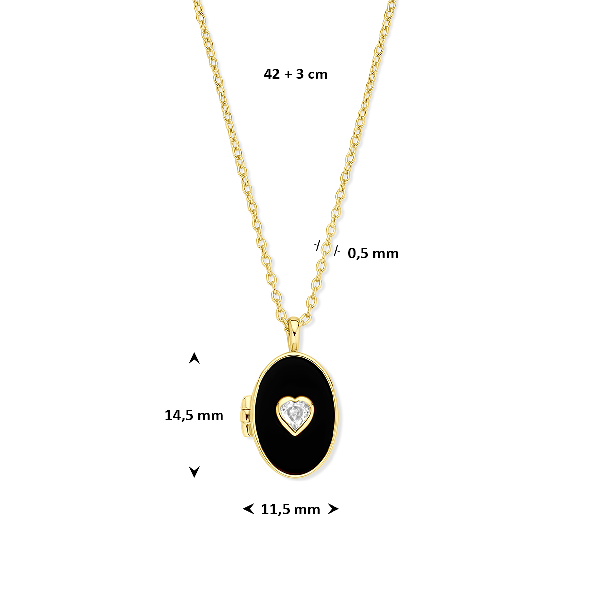 Verguld geel op 925 zilveren collier uitgevoerd met een hartje zirkonia en een onyx medaillon. Het collier heeft een draaglengte van 42cm met 3cm extensie. Geen garantie op plating.