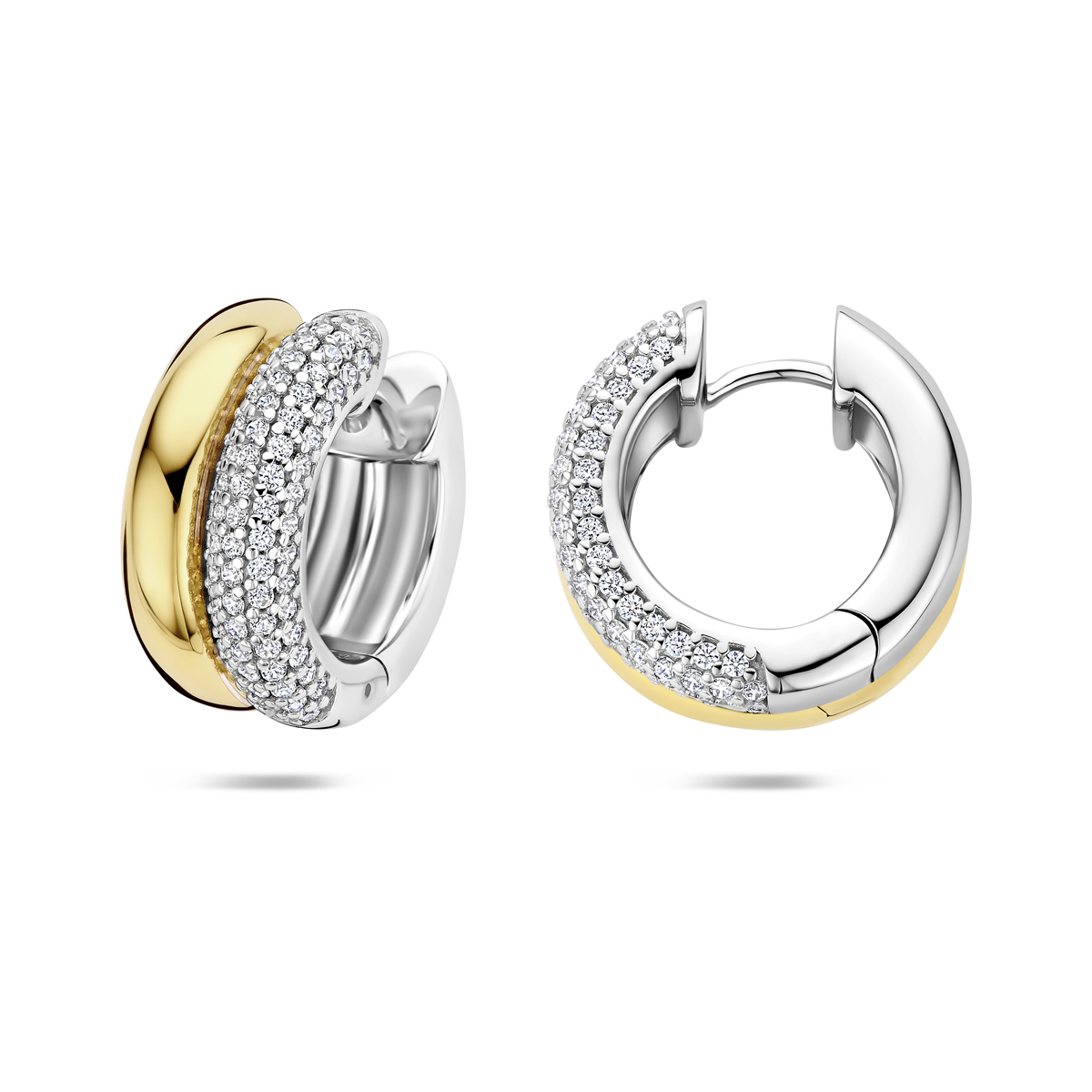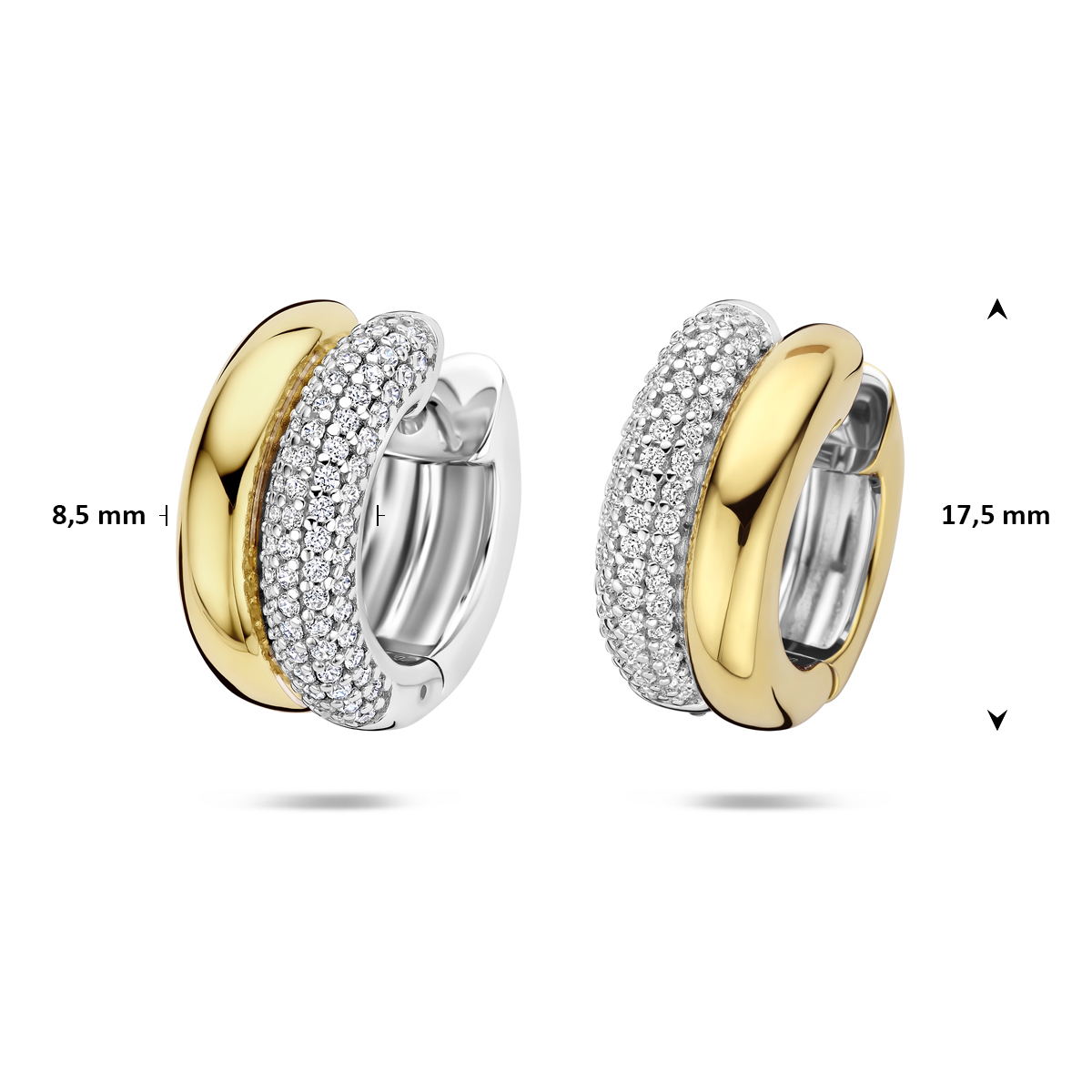 Verguld geel en gerhodineerd zilveren klapoorringen uitgevoerd met zirkonia. De klapoorringen hebben een afmeting van 17.5x8.5mm. Geen garantie op plating.