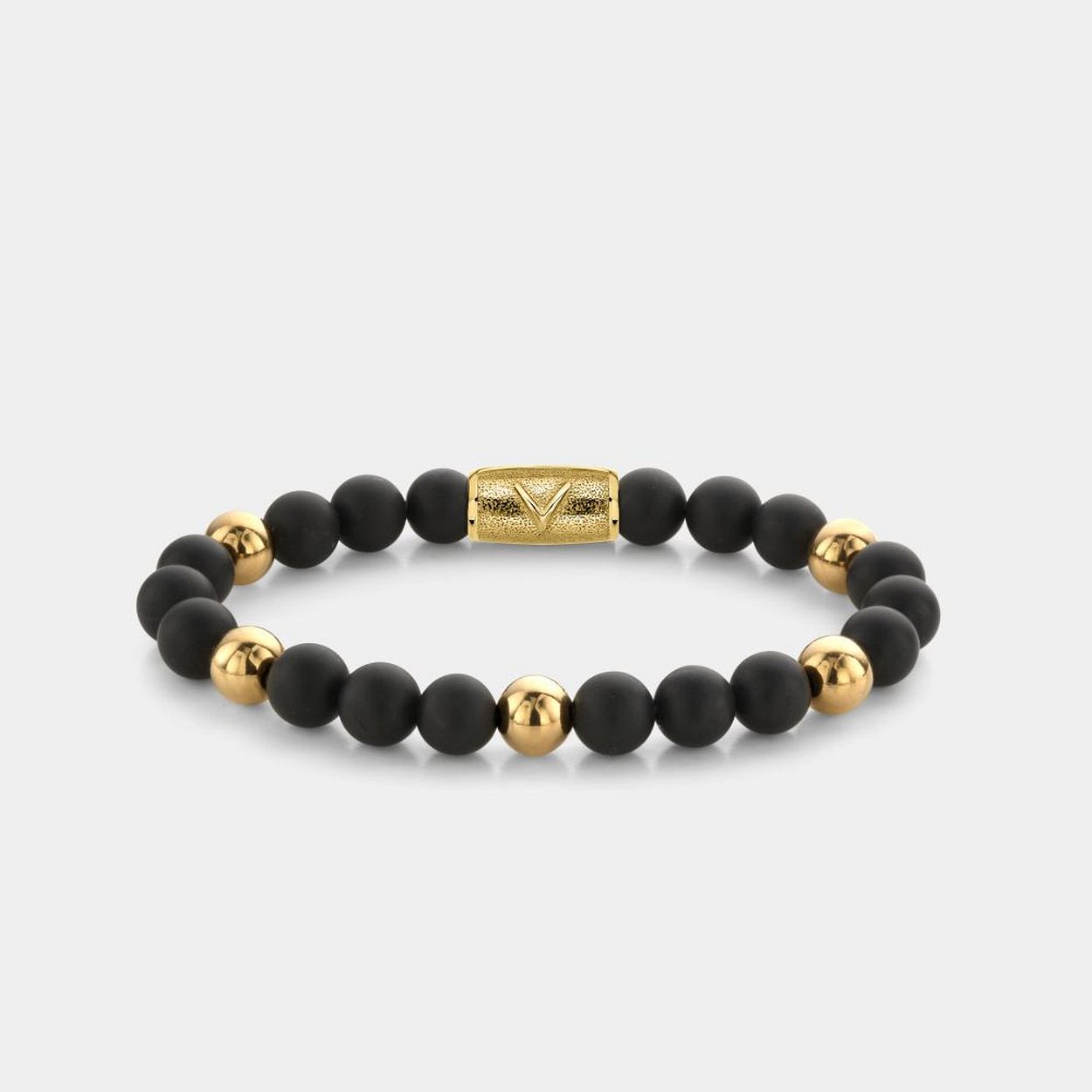 Natuurstenen armband van het merk Rebel & Rose. De armband heeft een hoogwaardige elastische stretch koord, en 8mm mat zwart Agaat natuurstenen en gold plated beads