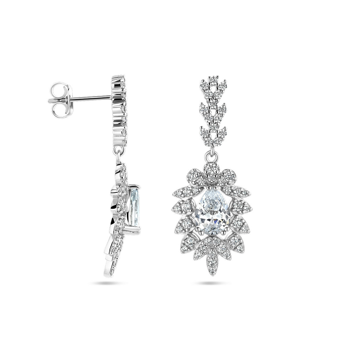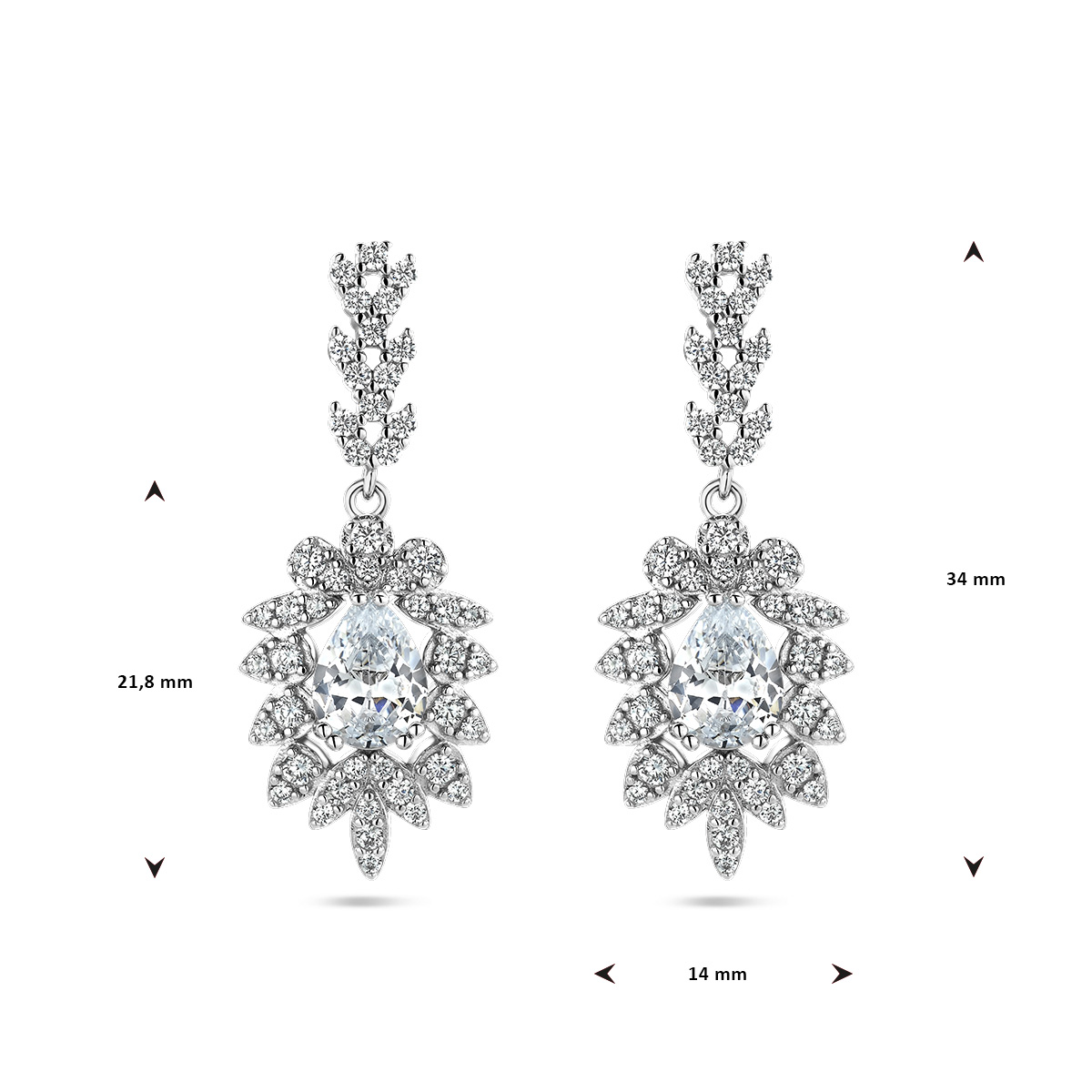 Gerhodineerd 925 zilveren oorhangers uitgevoerd met zirkonia. De oorhangers hebben een totale hoogte van 34mm.