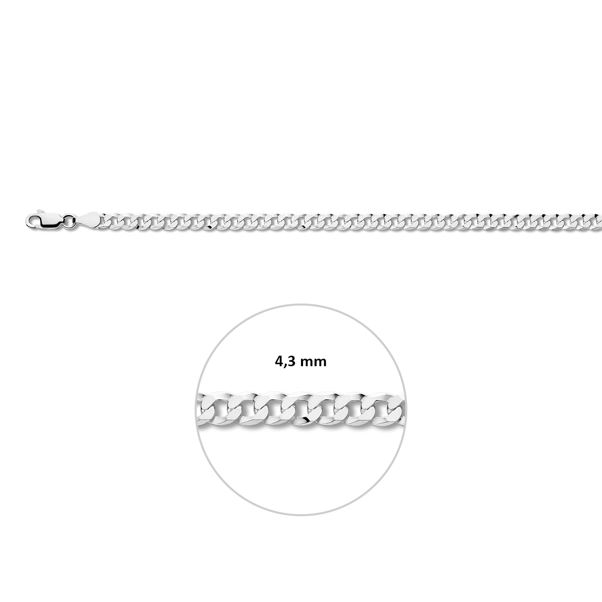 Gerhodineerd 925 zilveren gourmette lengte artikel met een schakelbreedte van 4.3mm. Het lengte artikel heeft een karabijn sluiting.